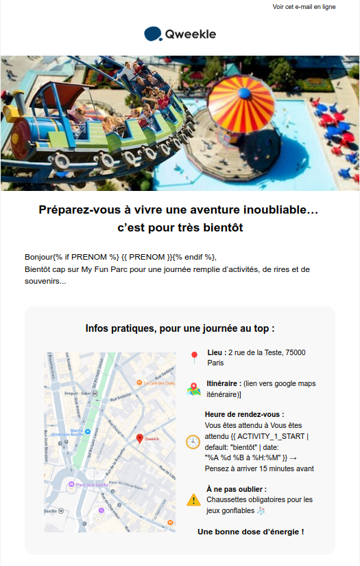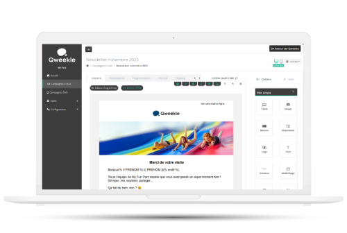 Nous sommes ravis de vous annoncer la mise en place de notre partenariat avec l’entreprise Qweekle, un acteur de référence de l’édition de logiciel de gestion pour activités de loisirs (billetterie, contrôle d'accès, caisse, réservations…). L’objet de ce partenariat est l’intégration dans Qweekle d’un module simple d’accès permettant la réalisation de campagnes email / SMS / automation. Finis les imports / exports avec des solutions externes.